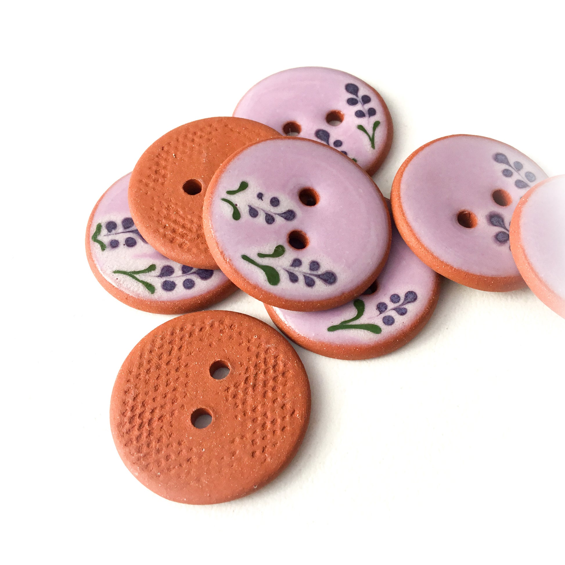 Each button and/or set is individually painted and one-of-a-kind. We sand all non-glazed edges for a smooth, snag-free surface.