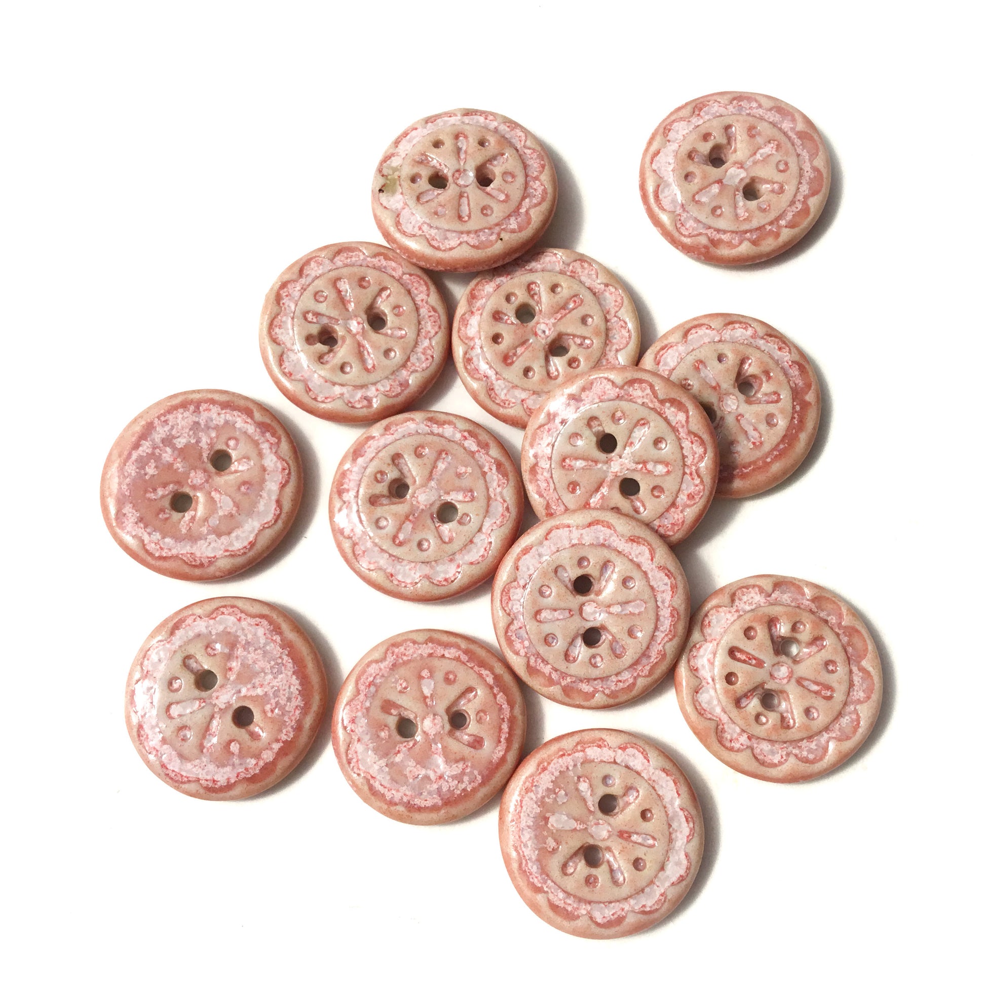 These porcelain buttons have a sweet, embossed flower stamp and shimmery pink glaze. They'd make a beautiful addition to your handwork!