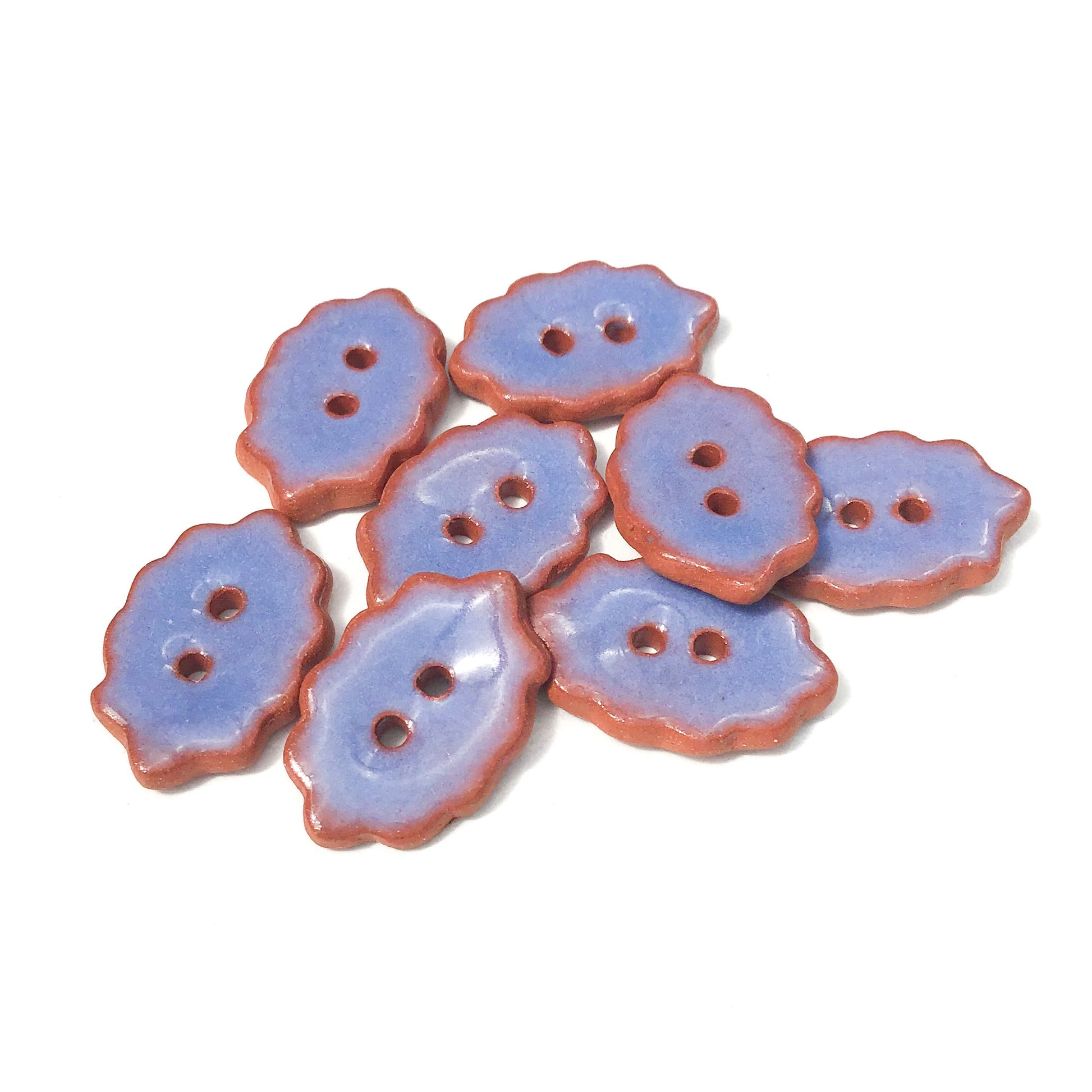 Scalloped, oval ceramic buttons in a lovely shade of purple. These buttons display a hazy purplish glaze that overlays red clay giving these a buttons a sweet and classy look.