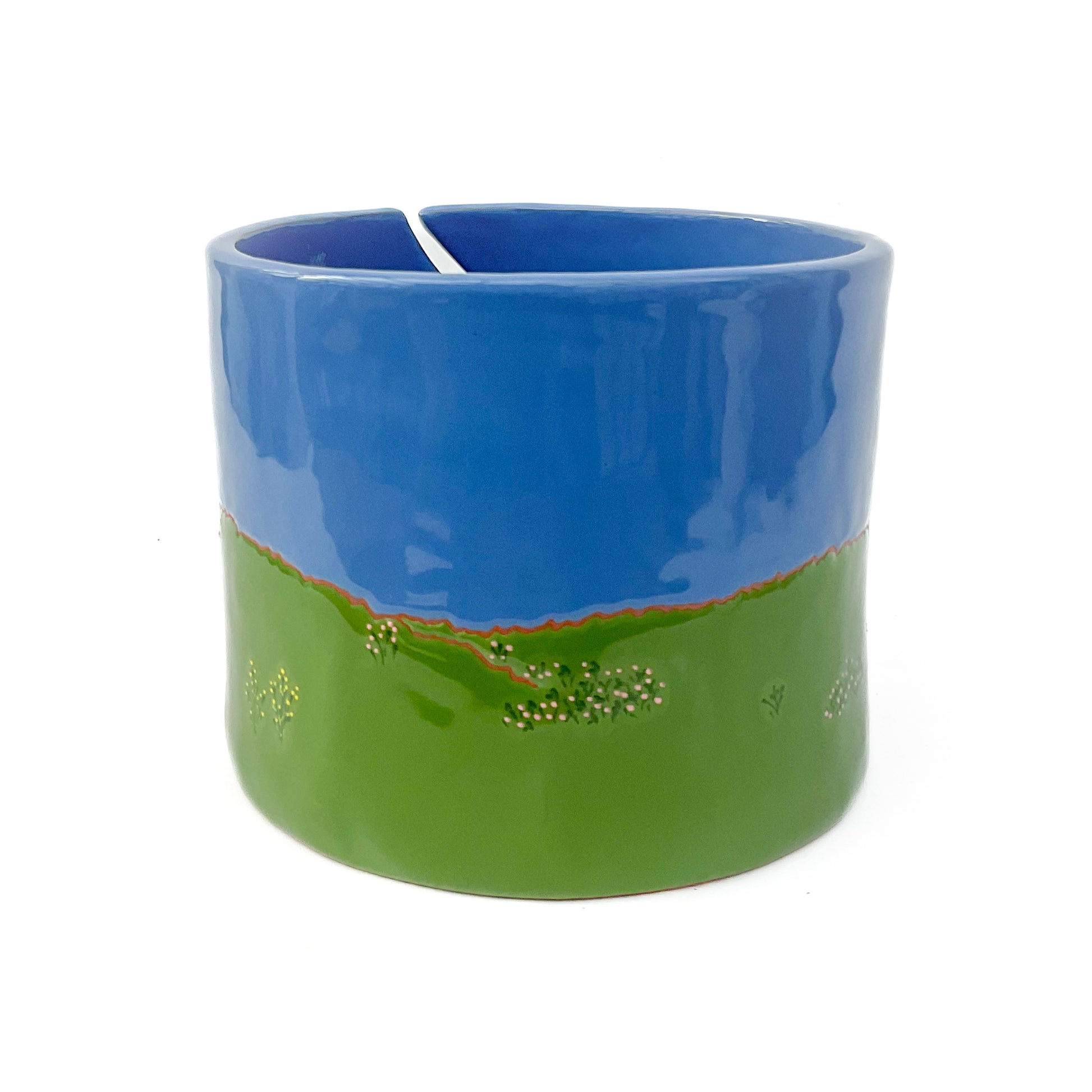 Each of our yarn bowls is hand made and formed to produce an organic and original look and feel. Several coats of ceramic glaze are applied to each piece for a smooth, glassy finish. The bottoms are left unglazed and sanded smooth.
