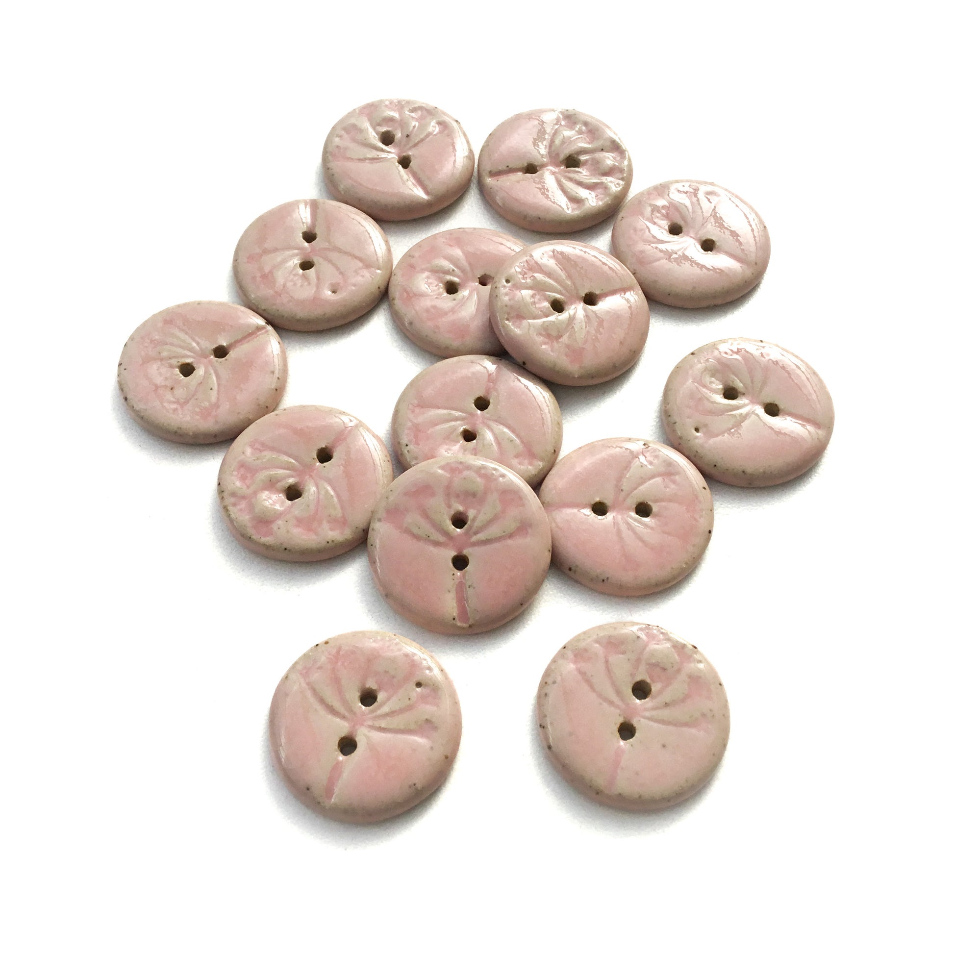Add a handmade touch to your project with these sweet hand stamped stoneware buttons. Each features a delicate umbel-shaped floral design, perfect for giving a unique look to any creation.