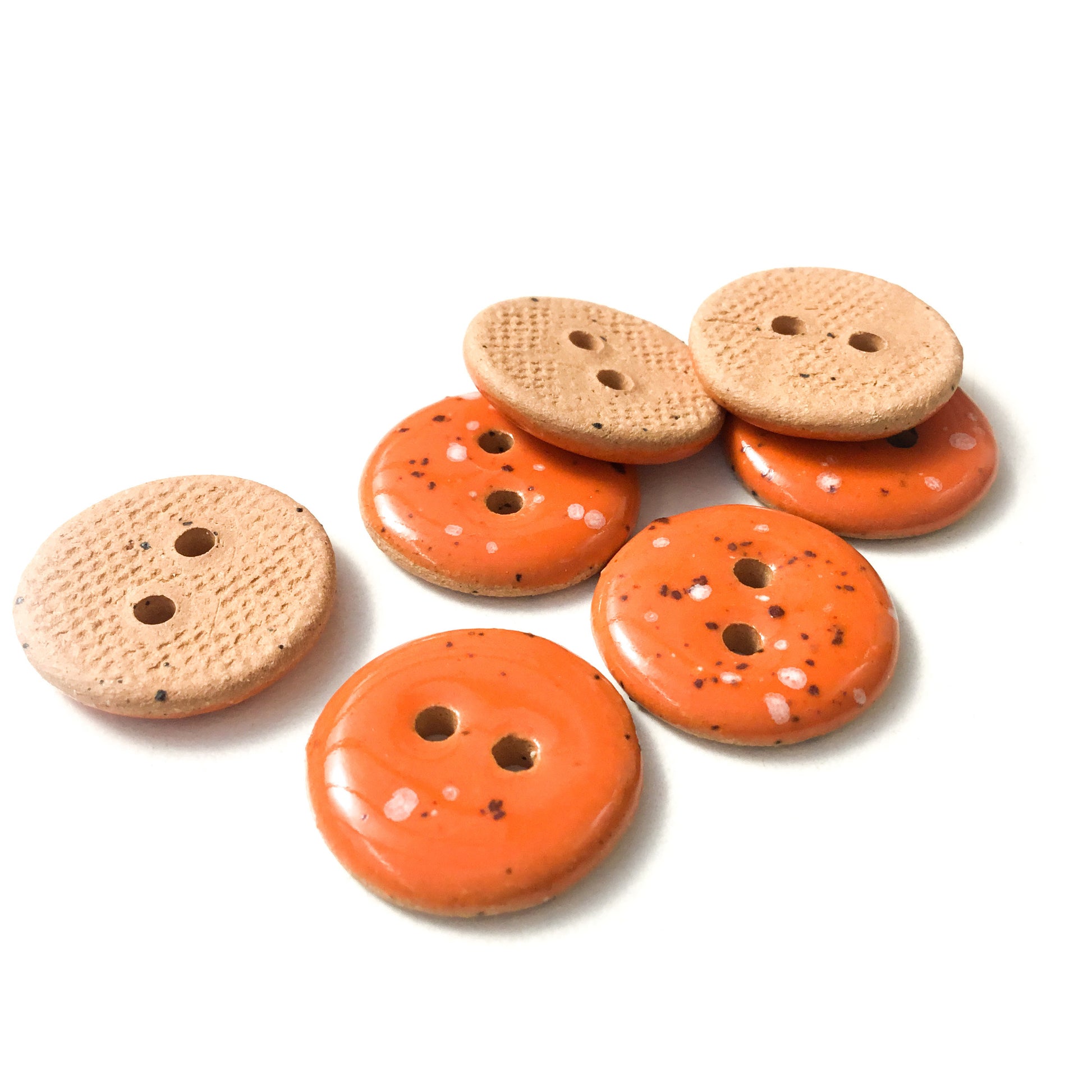 Round ceramic buttons on brown clay in a lovely shade of deep orange with white and black speckles.