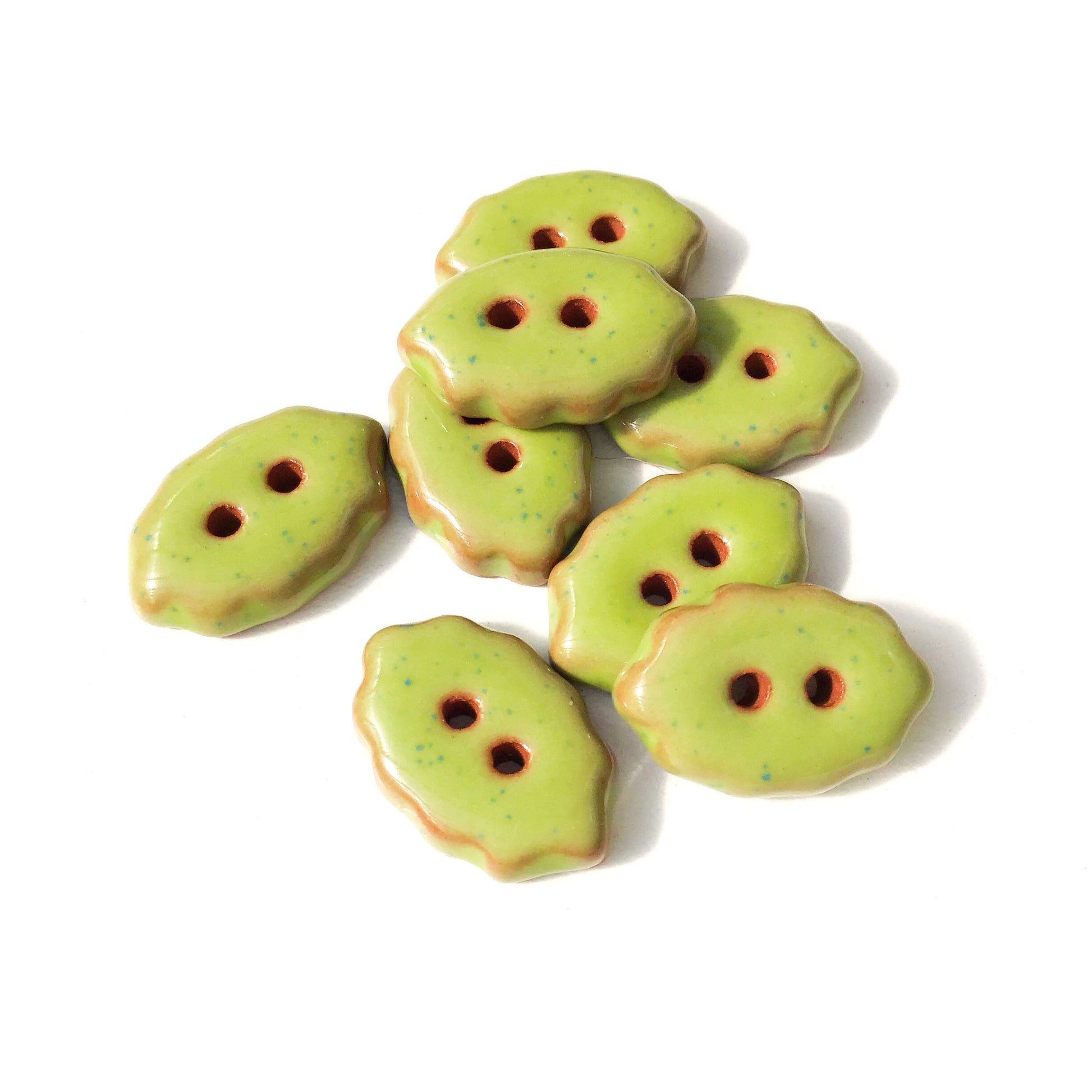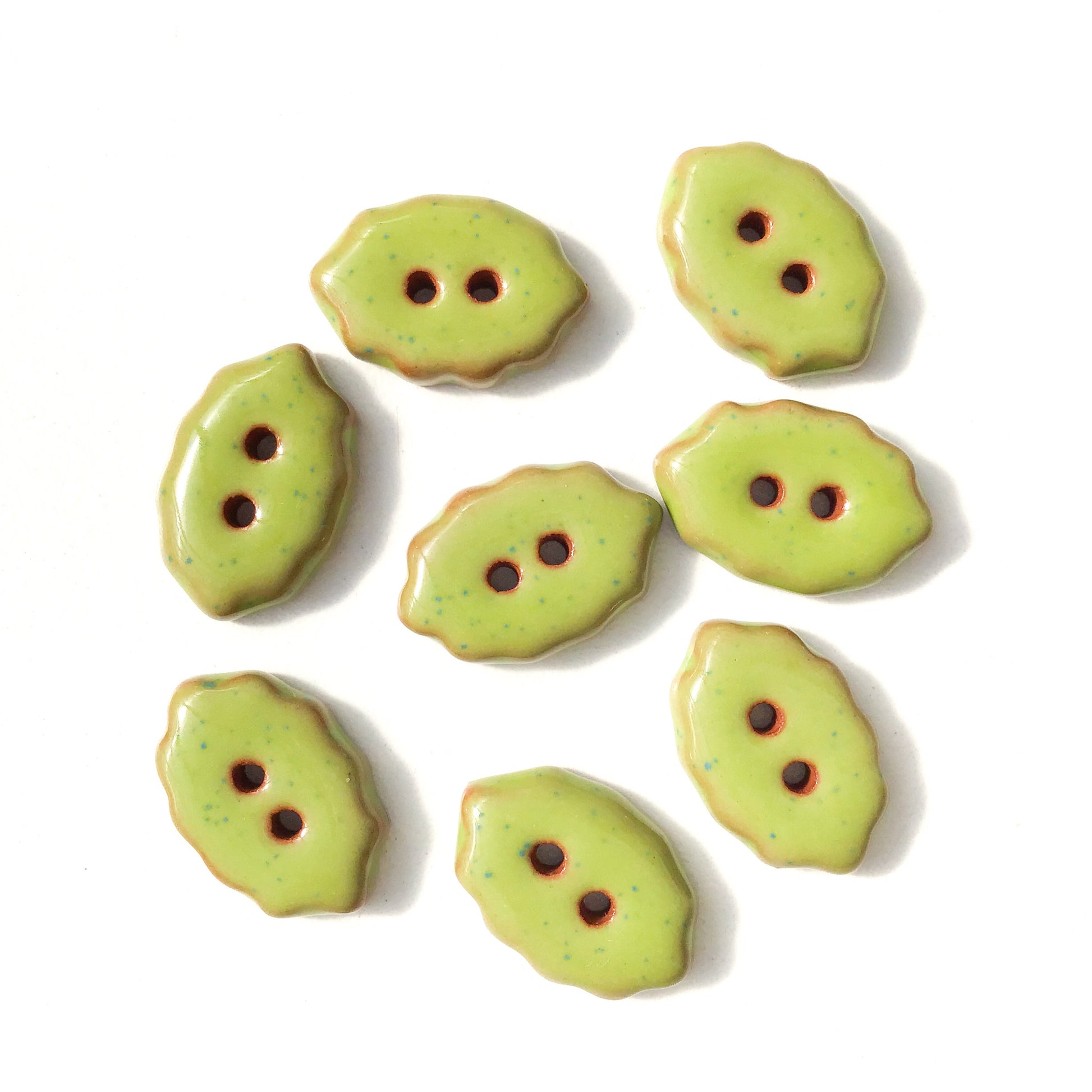 These oval ceramic buttons have a sweet scalloped edge and a bright sour apple green glaze with small flecks of blue. They'll add a darling touch to your handwork!