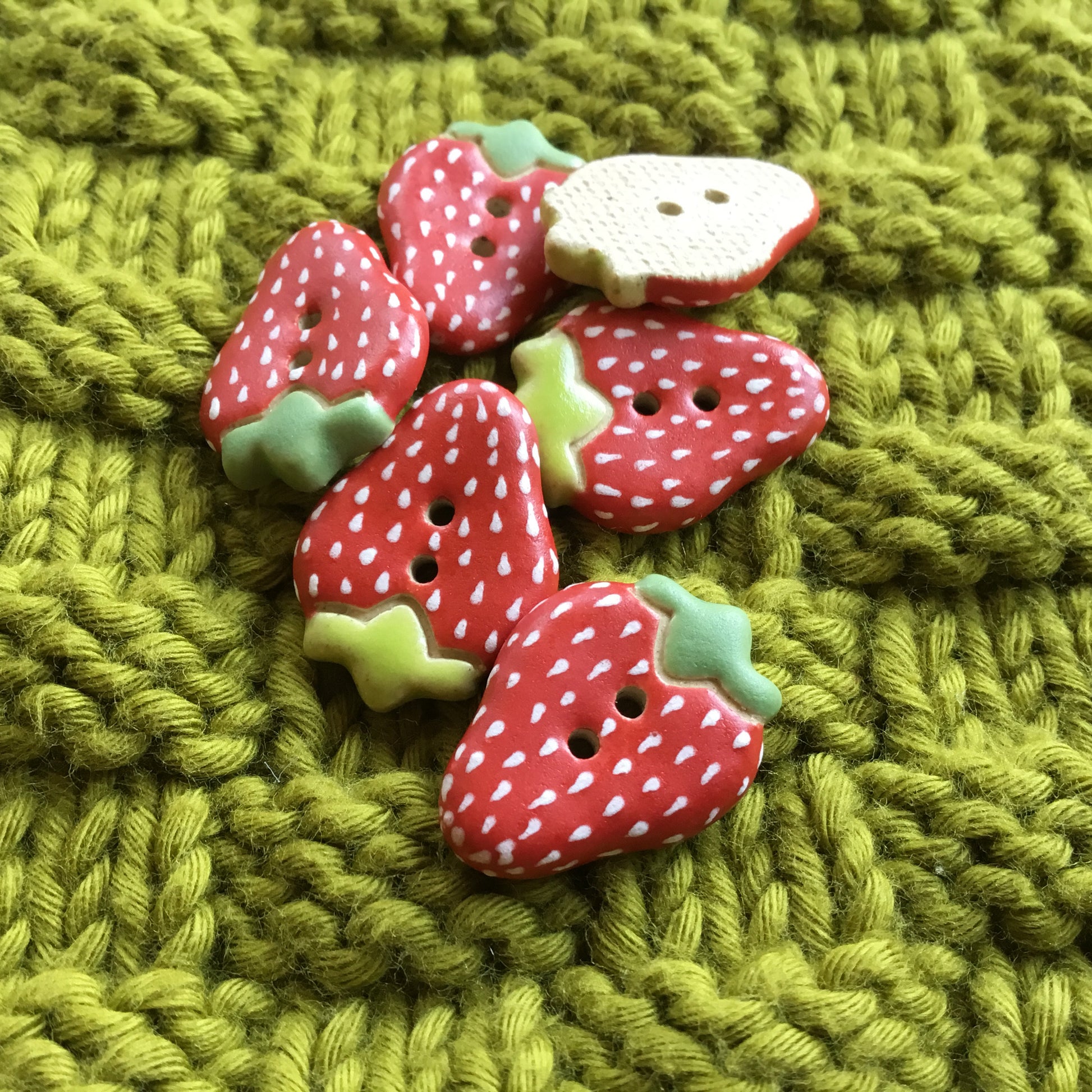 These stoneware strawberry buttons have a smooth, matte glaze with slightly elevated white seeds. They’re sure to add a unique & fun addition to your handwork!