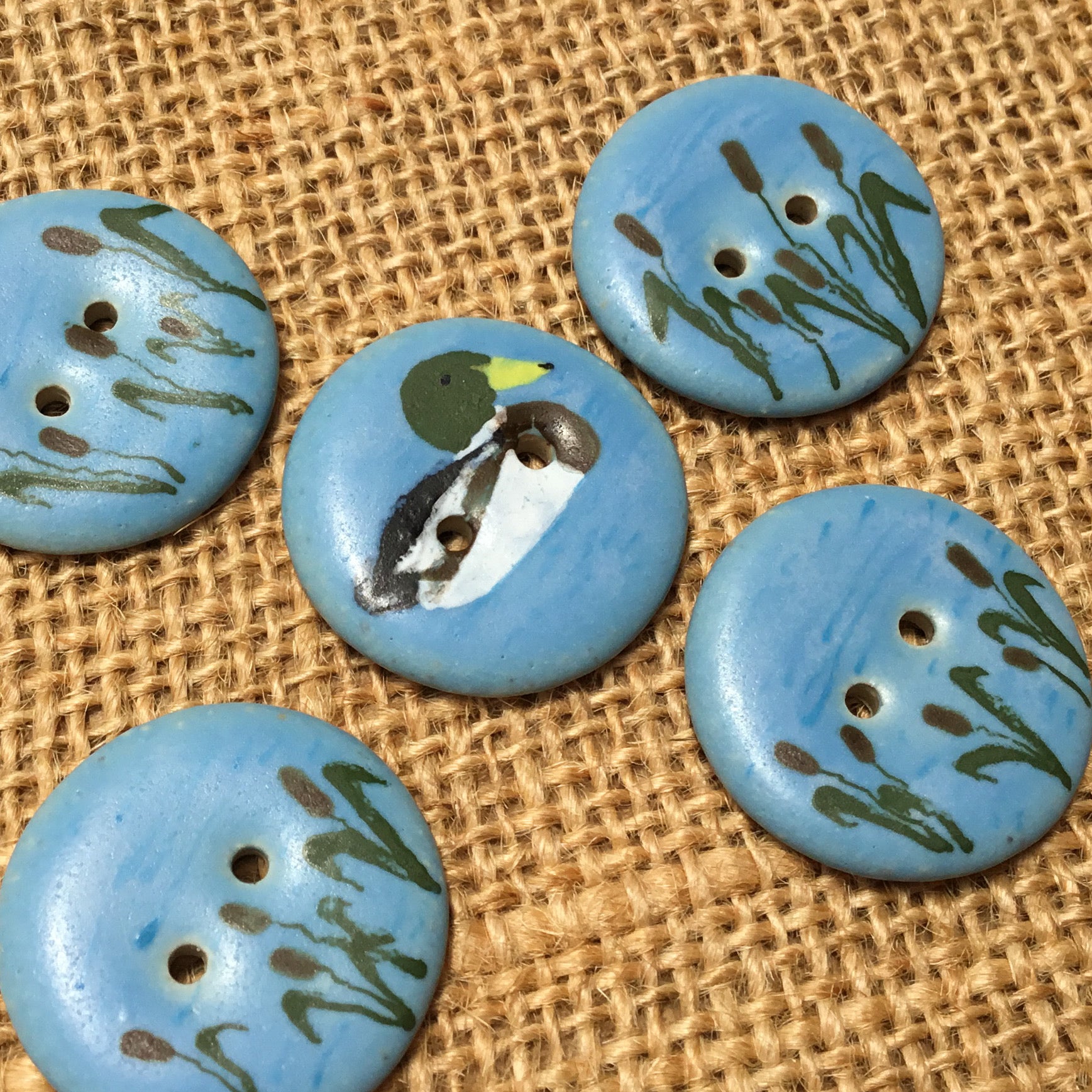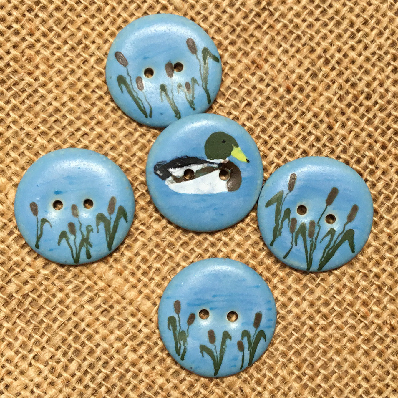 This one-of-a-kind set of hand-painted stoneware buttons features four buttons with cattails and one with a mallard in the water. It's sure to add a darling touch to any project!