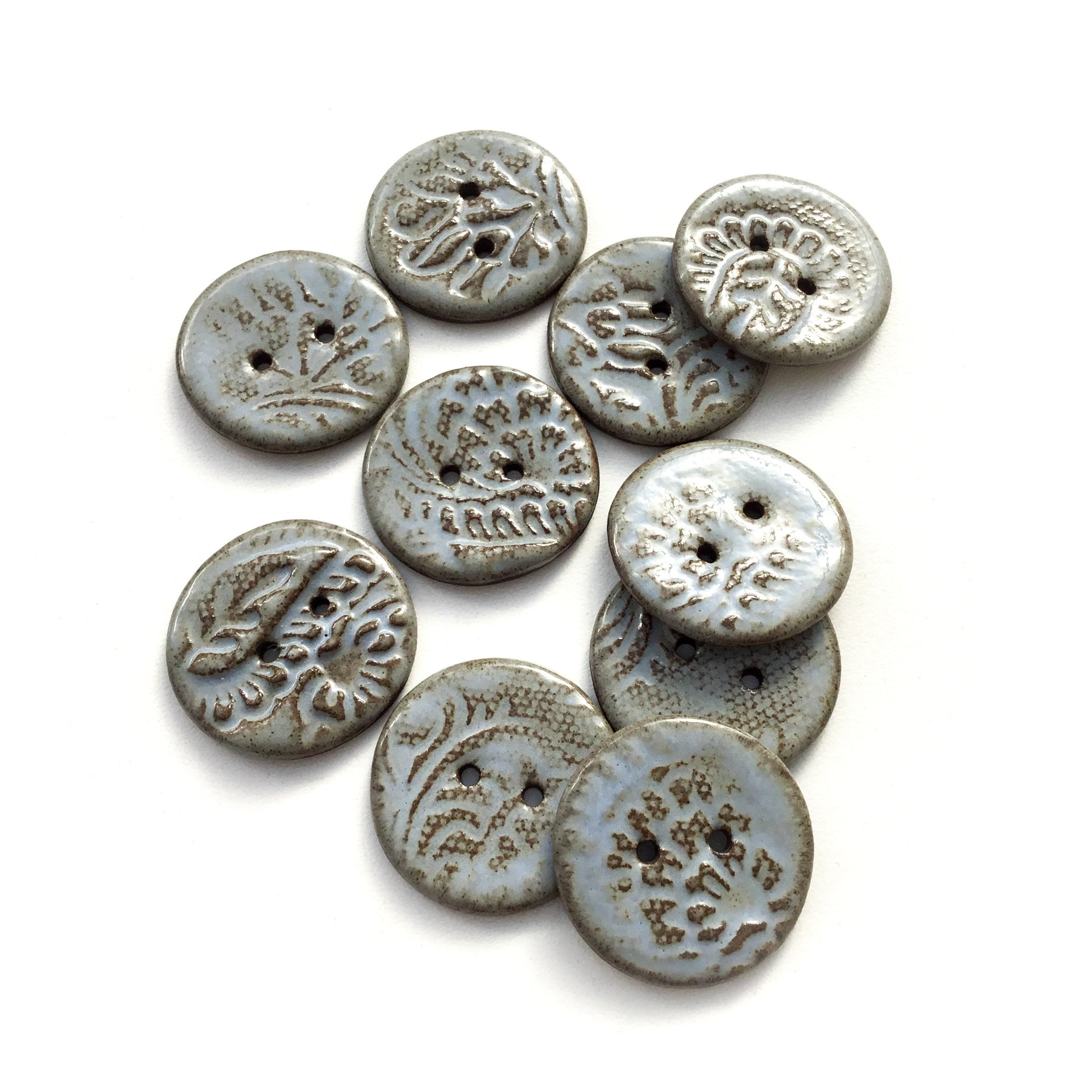 Add additional depth to your handwork with these hand stamped black clay buttons in a warming shade of gray-blue.