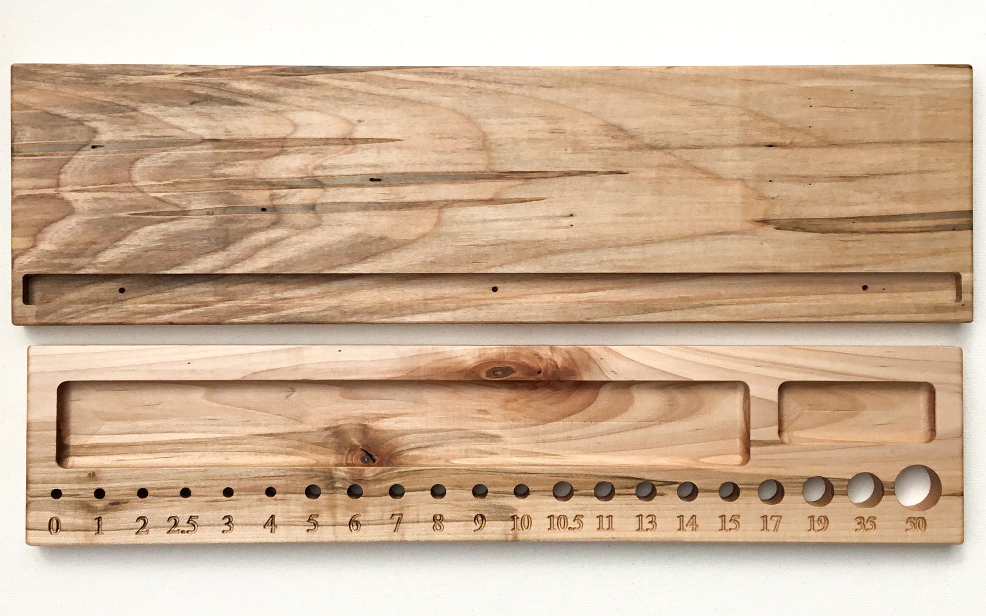 - 21 holes labeled for US needle sizes 0, 1, 2, 2.5, 3, 4, 5, 6, 7, 8, 9, 10, 10.5, 11, 13, 14, 15, 17, 19, 35, & 50