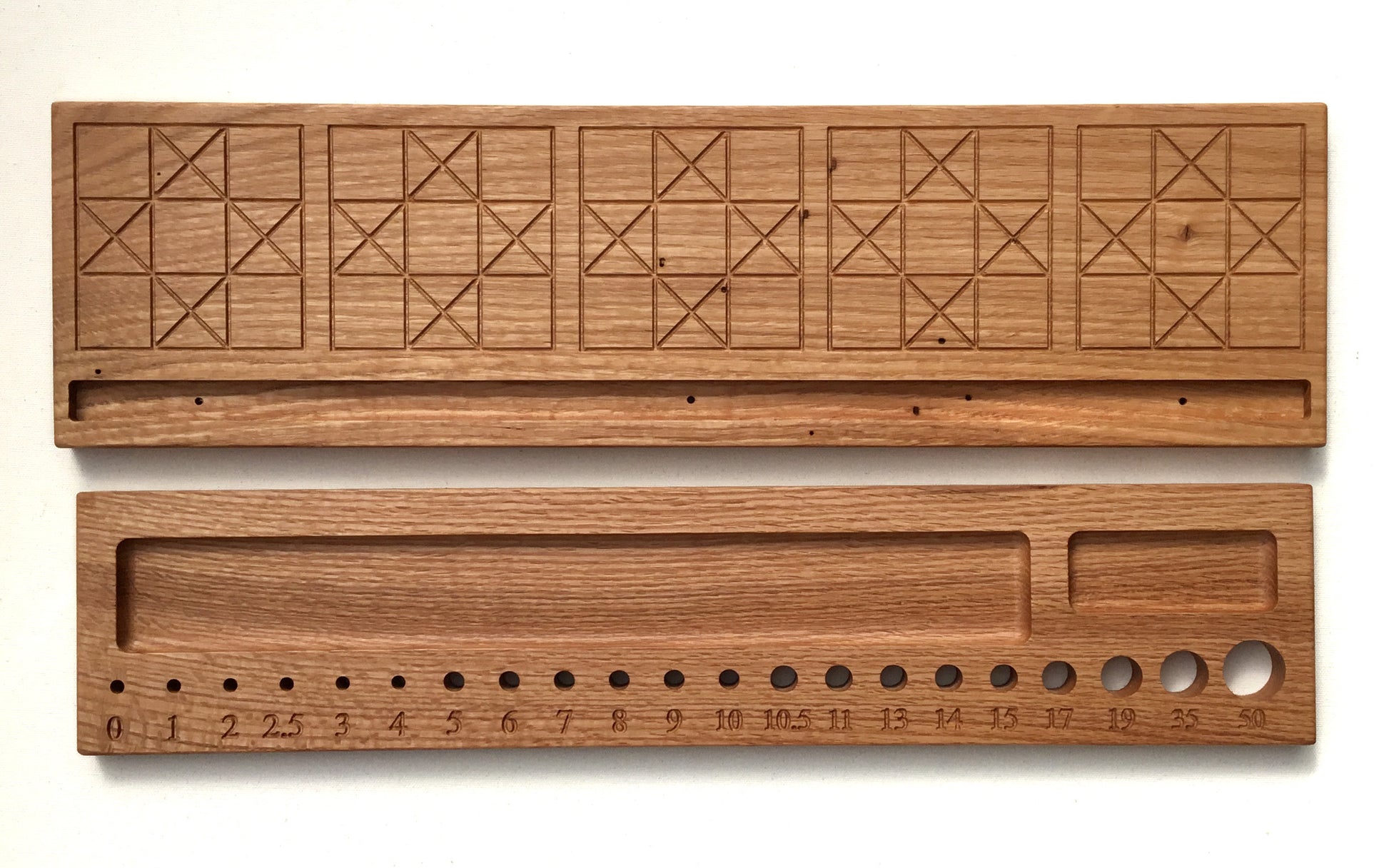 - 21 holes labeled for US needle sizes 0, 1, 2, 2.5, 3, 4, 5, 6, 7, 8, 9, 10, 10.5, 11, 13, 14, 15, 17, 19, 35, & 50