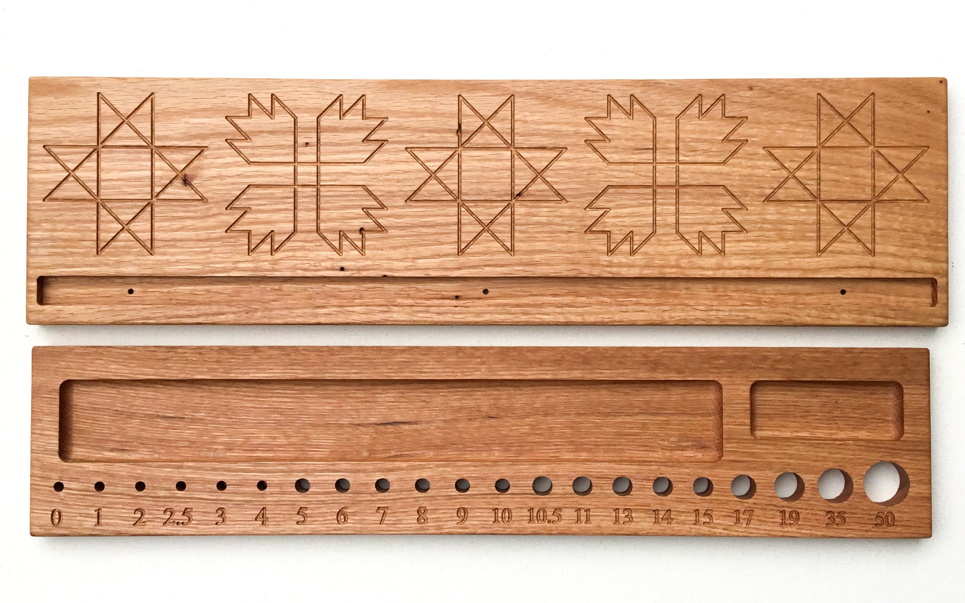 - 21 holes labeled for US needle sizes 0, 1, 2, 2.5, 3, 4, 5, 6, 7, 8, 9, 10, 10.5, 11, 13, 14, 15, 17, 19, 35, & 50