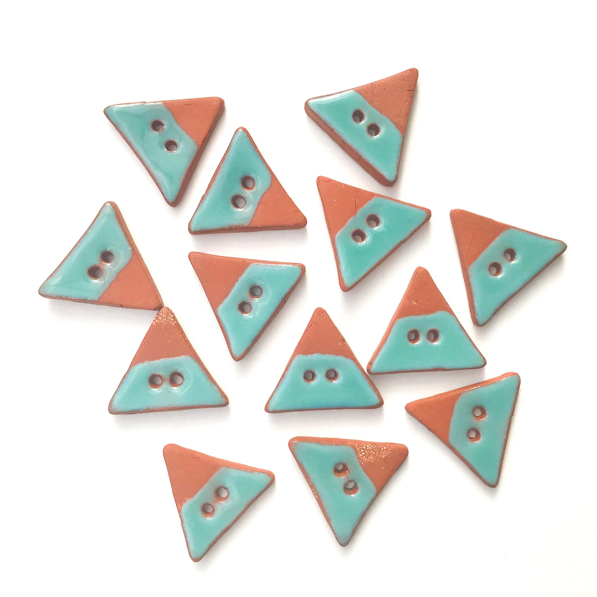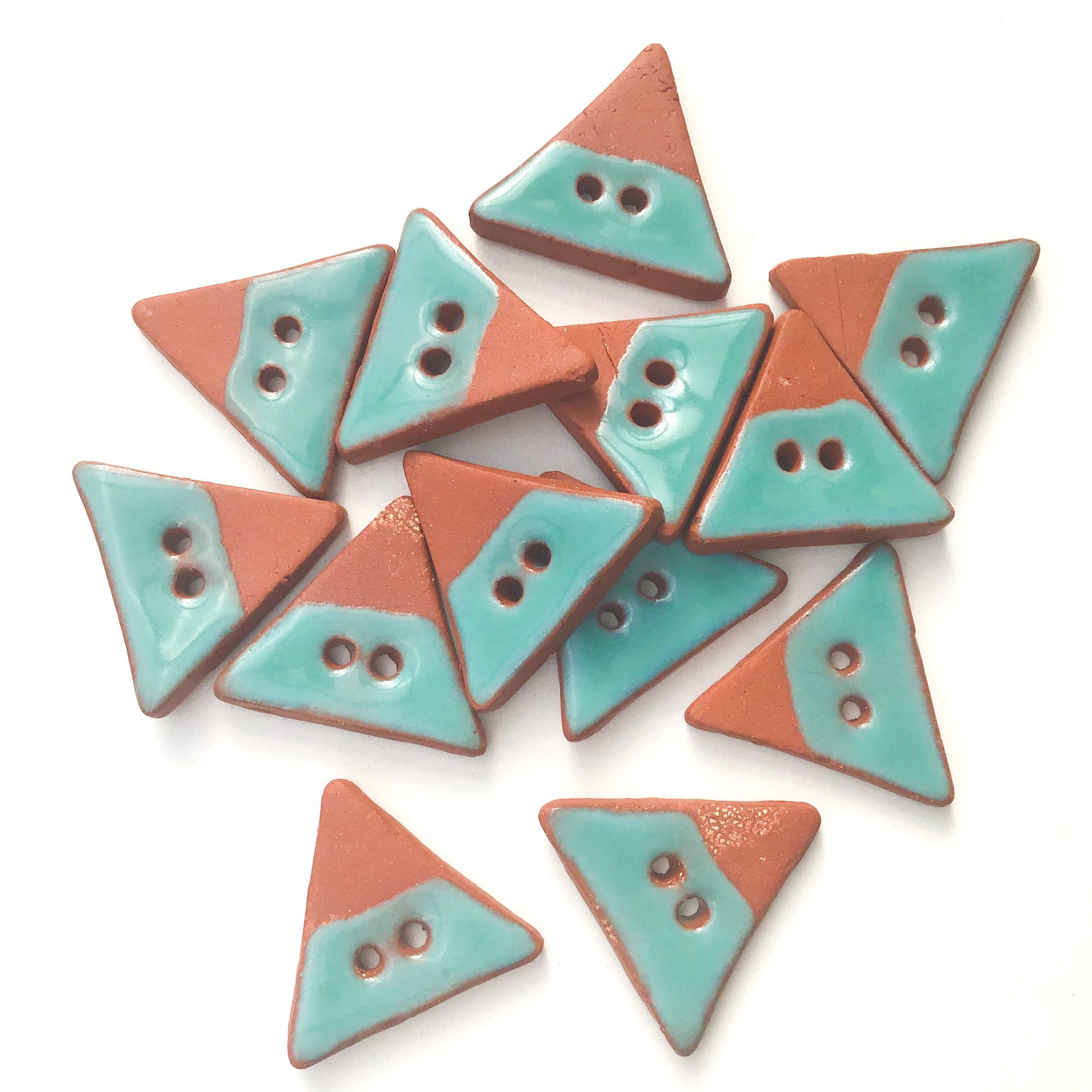 These unique triangular clay buttons are coated on the bottom top half with a glossy turquoise glaze. They'd add a fun touch to your hand work!