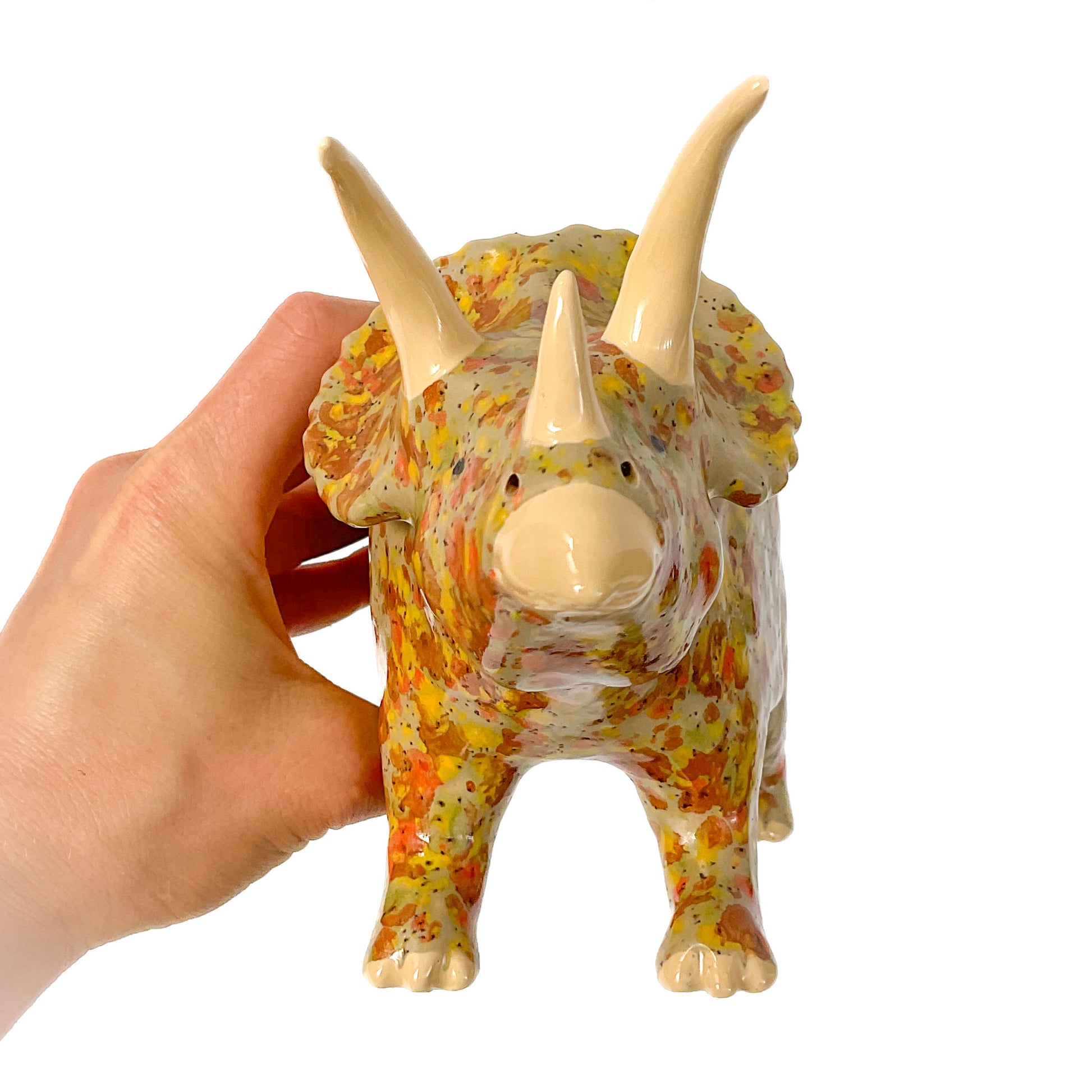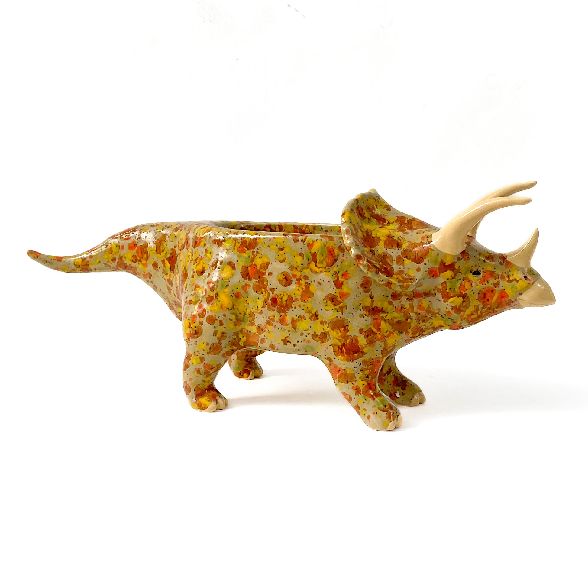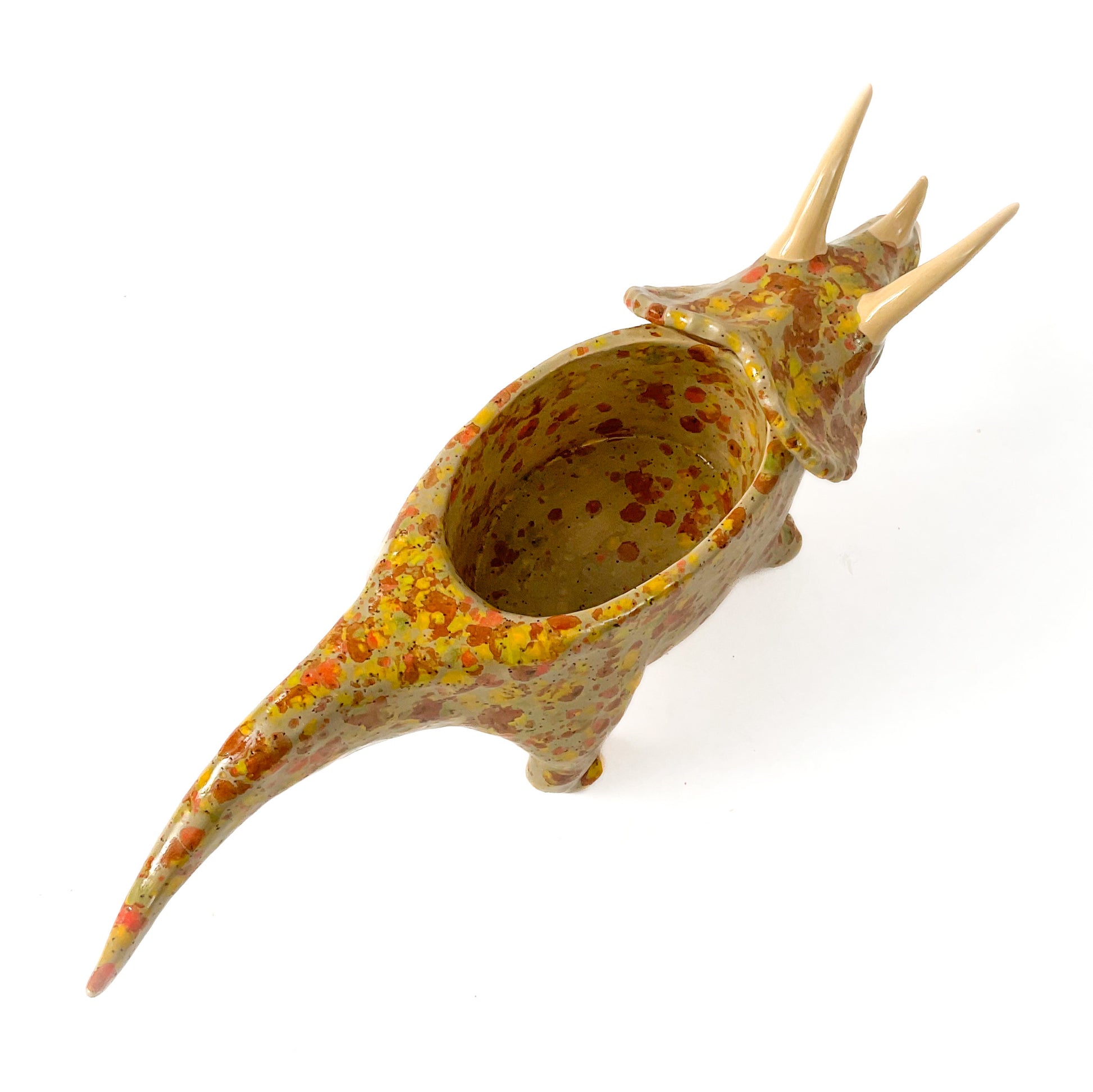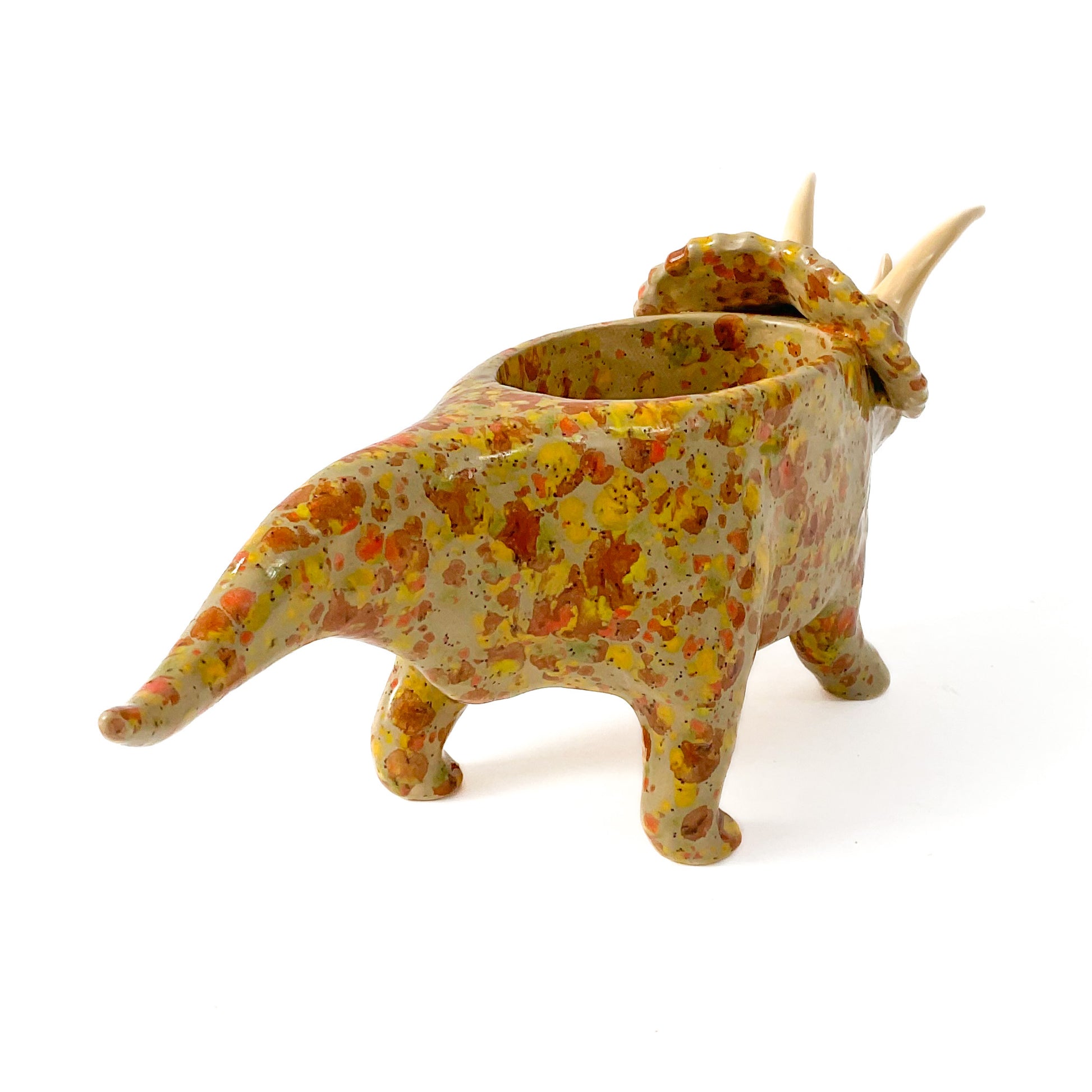 A ceramic triceratops planter, with some fierce dino horns, to pot up your favorite plant or use as a dish for candy and more.