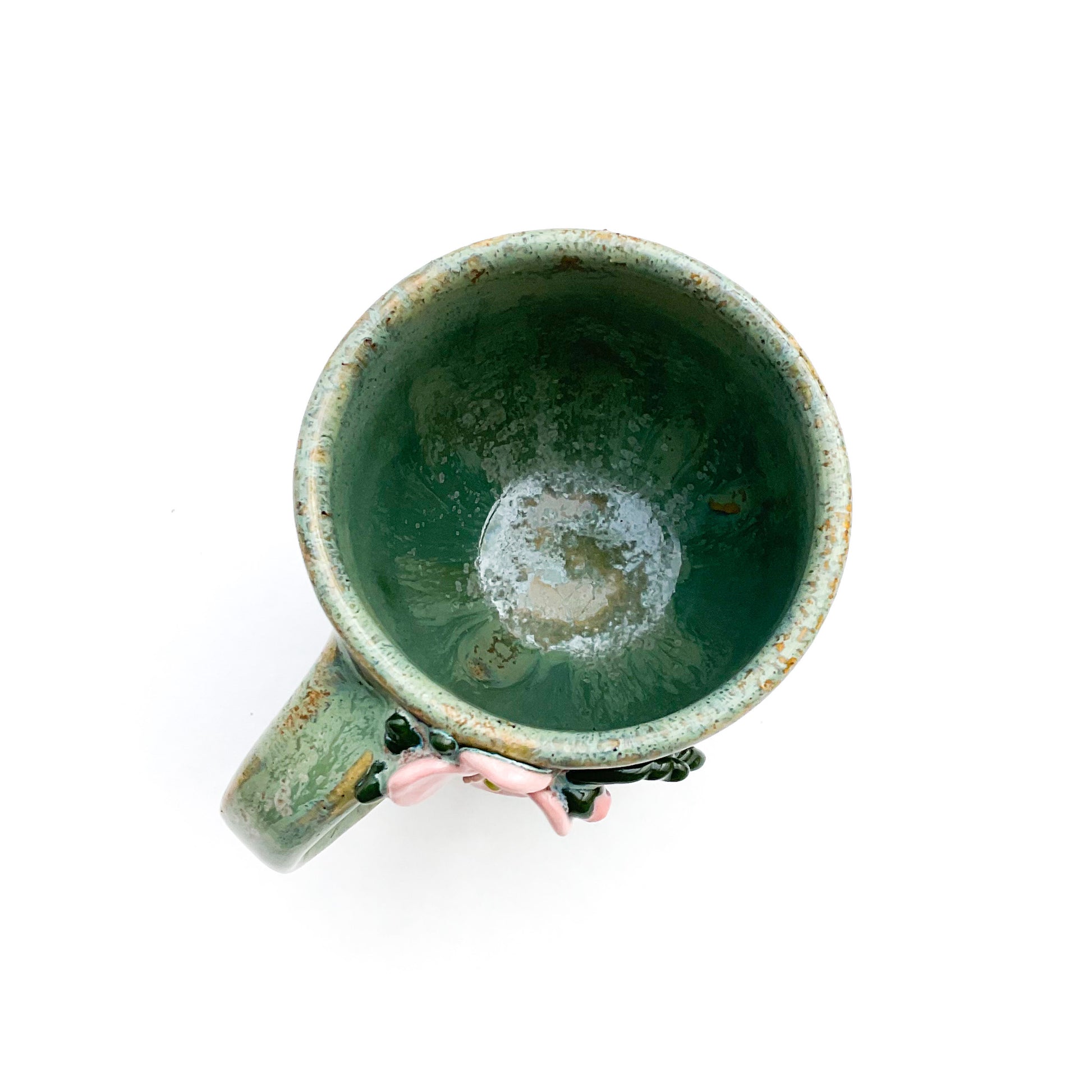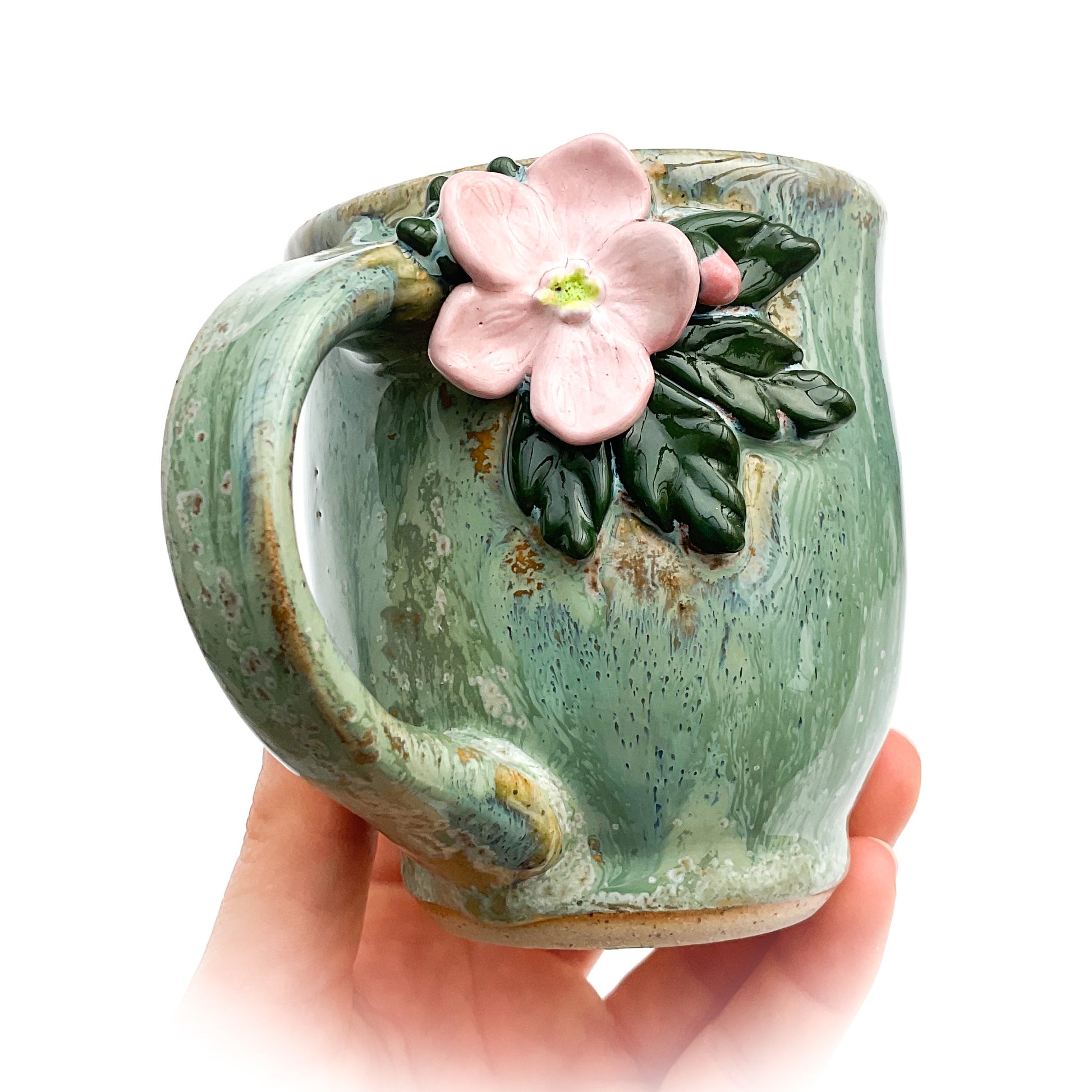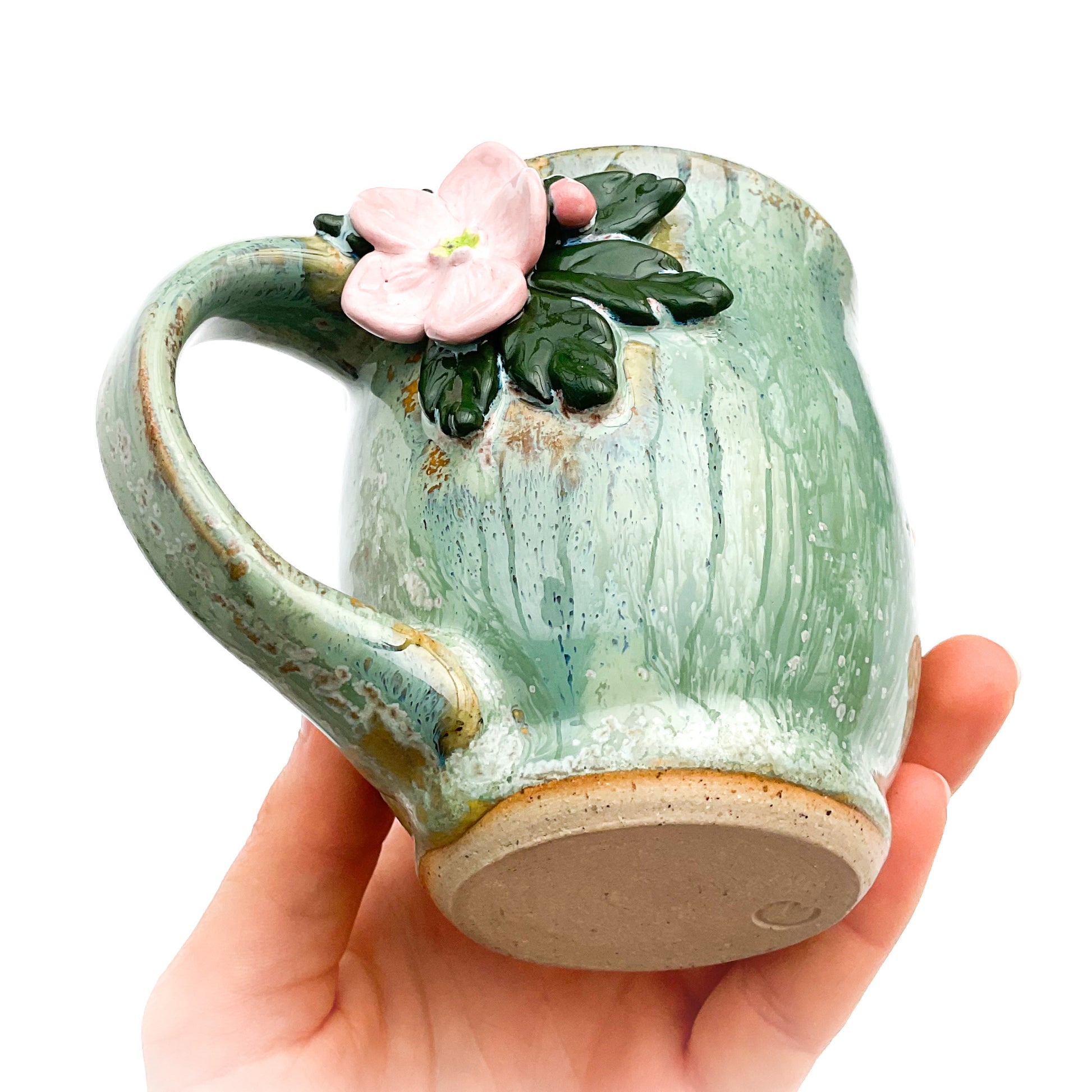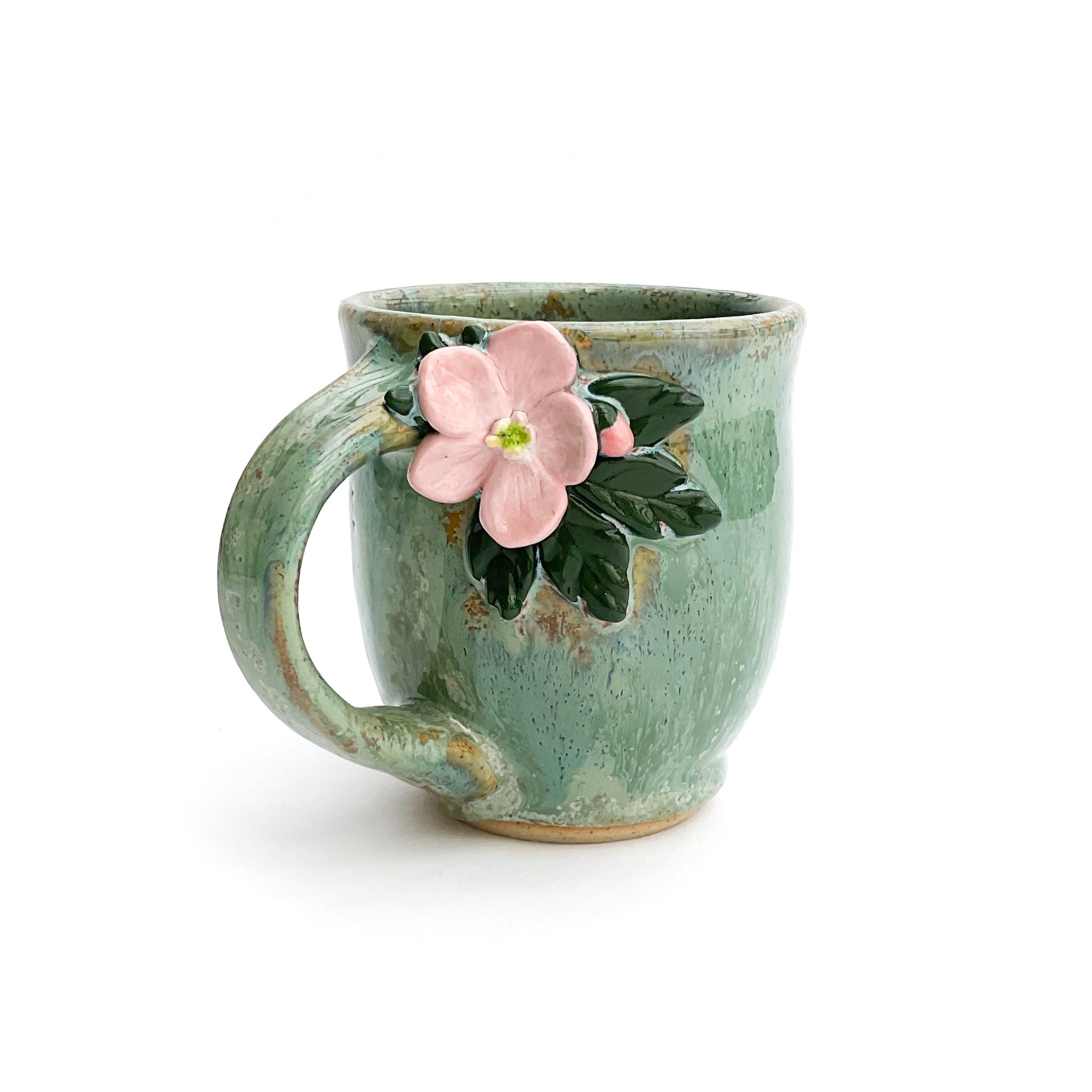 This unique hand sculpted flower mug, crafted by Hoof Print Pottery in southeast Ohio, is a one-of-a-kind masterpiece! Every detail of this original mug is skillfully made by hand, one petal, bud, and leaf at a time. After each small piece is sculpted it is adhered to the unfired mug using only clay and water. After the raw clay mug is thoroughly dried it is bisque fired in the kiln to 1,945°F. When the mug is cooled it is then hand painted and refired (glaze fired) to 2,300°F.