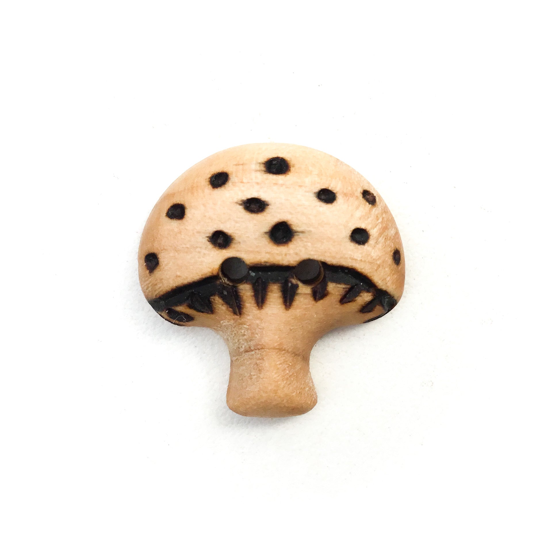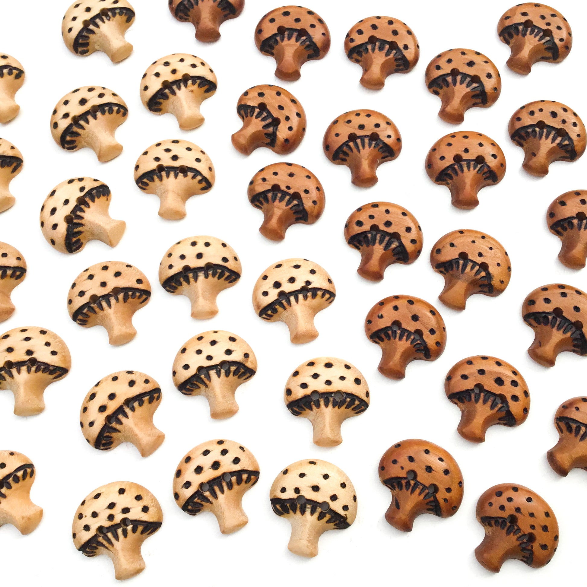 Choose from the light, soft color of maple wood or the warm, reddish hue of cherry wood for your next project with these unique mushroom buttons. Each button is cut out and wood burned individually for a fun and earthy appeal.