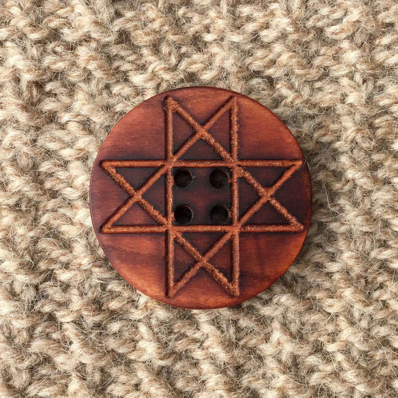 Large cherry wood button with carved quilt pattern