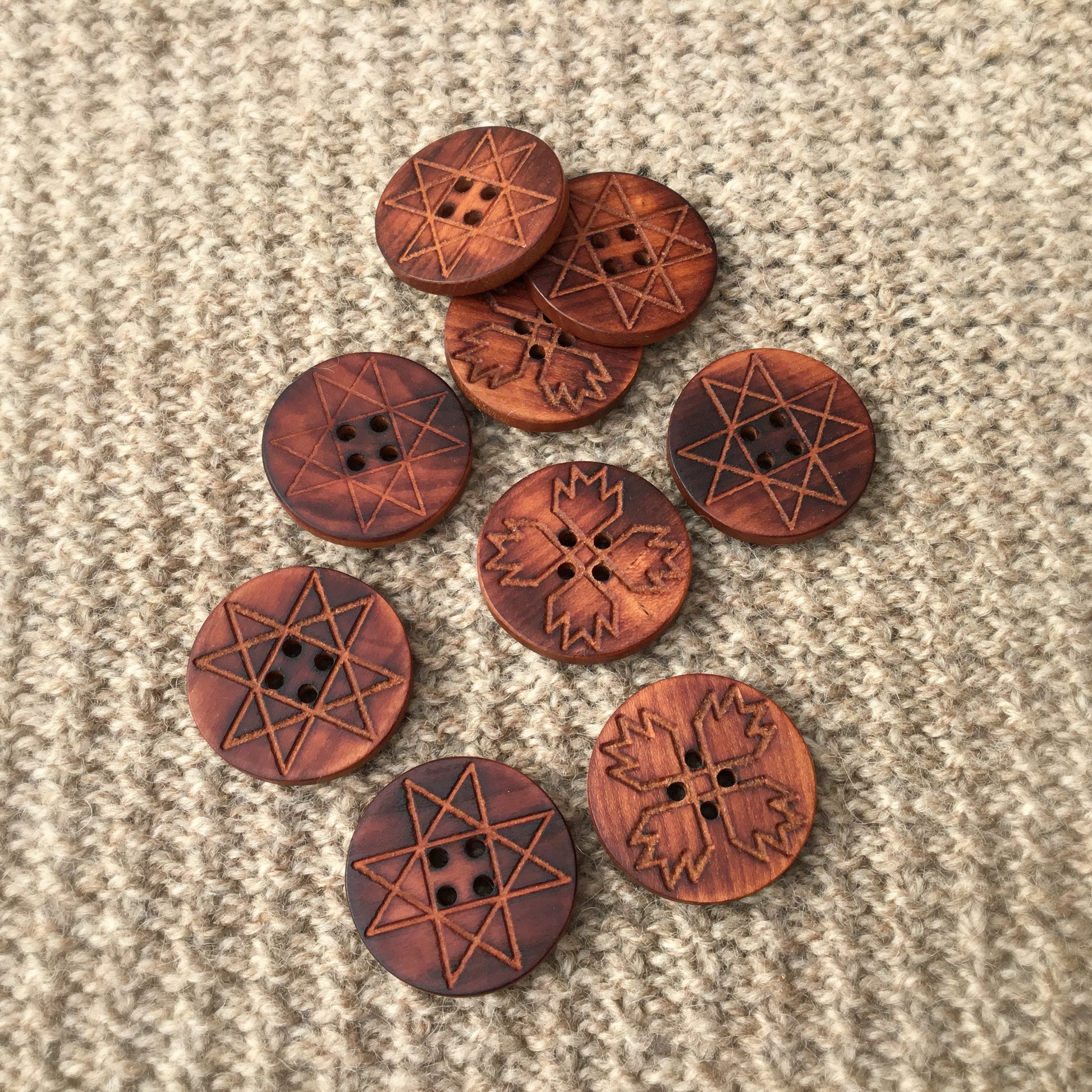 Each button and/or set is one-of-a-kind. We sand each button silky smooth and coat in an all-natural oil and beeswax finish.